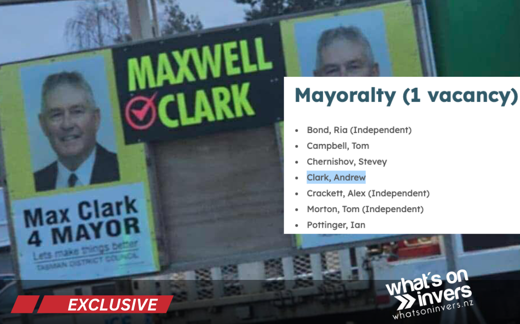 A new surprise has turned up in the Invercargill Mayoralty race - but it has a twist. Nobby Clark’s brother is standing for Mayor in both the south and in Tasman, but under two different names. Andrew Clark turned up on the list of nominations this week, and placards