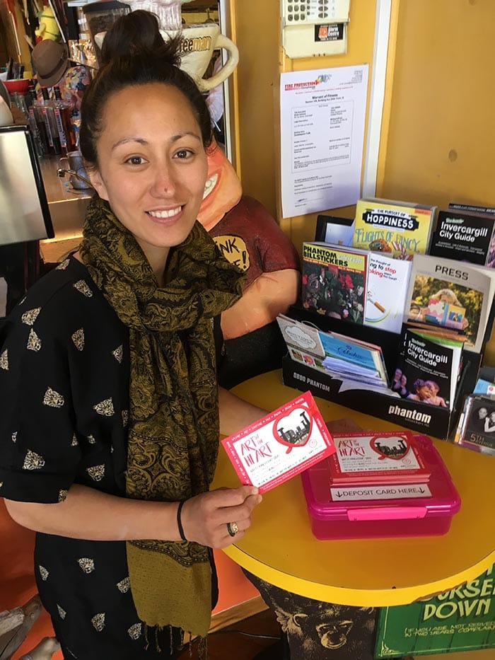 Art Centre Project Invercargill assistant Ramari Paul drops off some ‘Art in the Heart’ postcards at Zookeepers in Invercargill.