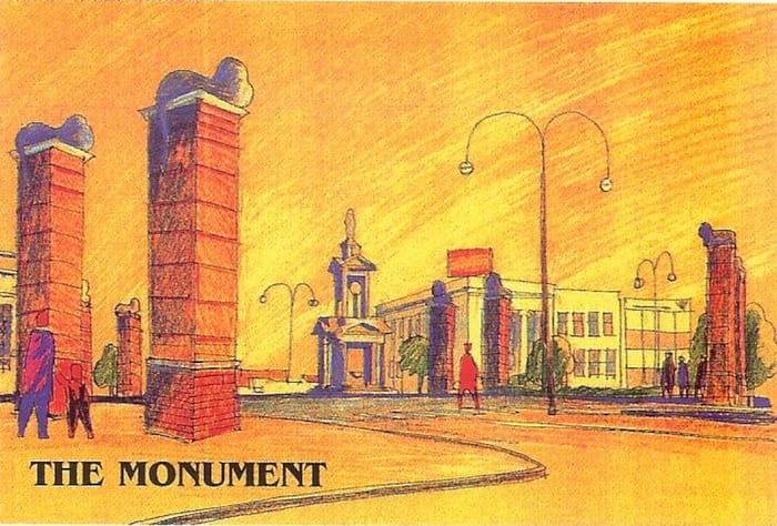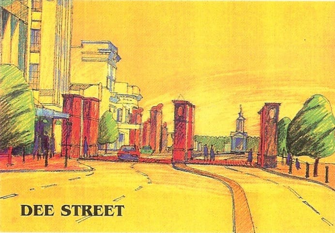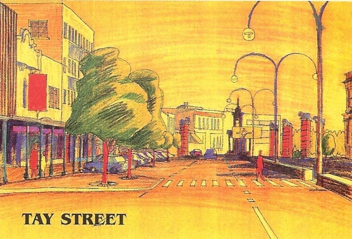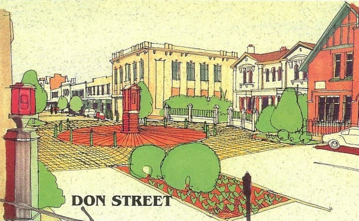 Proposed plans for Don Street as part of the city upgrade. Would like to know how cars would have driven around this thing. Kinda a good thing they decided to put an umbrella there instead. photo: Old Invercargill