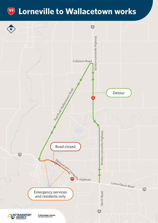 The 1.3km section of SH99/Wallacetown-Lorneville Road, between the intersections of Ryal Bush-Wallacetown Road and Underwood-Linds Bridge Road, is scheduled to be closed for culvert strengthening to provide flood protection, from 6.30am on Monday 23 February through to Monday 9 March (see map below).