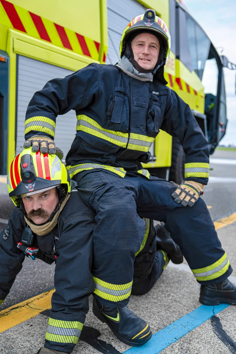 Two Invercargill Airport firefighters are trading their usual serious demeanor for cheesy 80s-style photoshoots as they prepare to tackle one of New Zealand's most grueling charity challenges.
