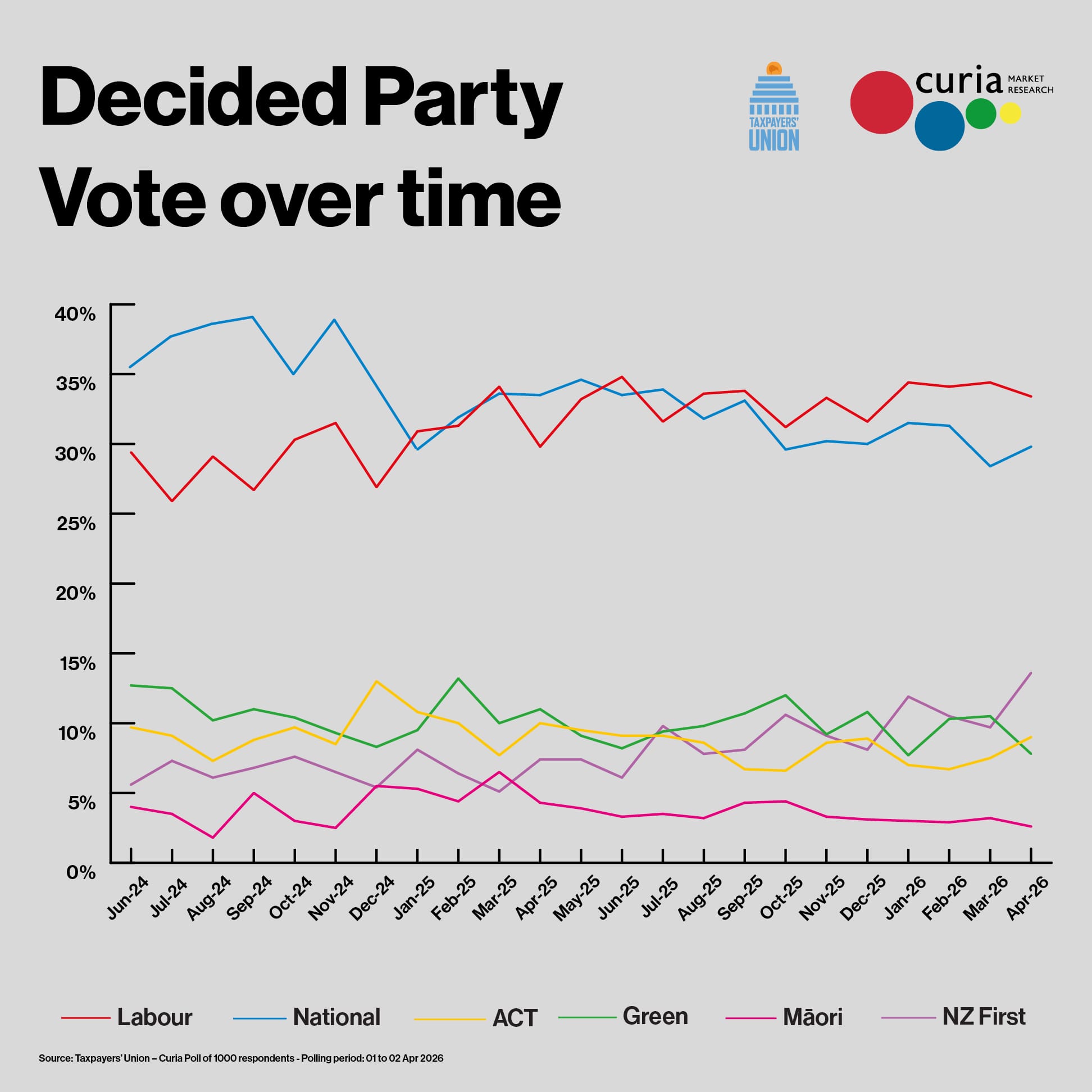The Taxpayers' Union-Curia poll shows New Zealand First jumping 3.9 points to 13.6%, its highest level on record. The surge comes as Labour dropped 1.0 point to 33.4% and the Greens fell 2.7 points to 7.8%.
