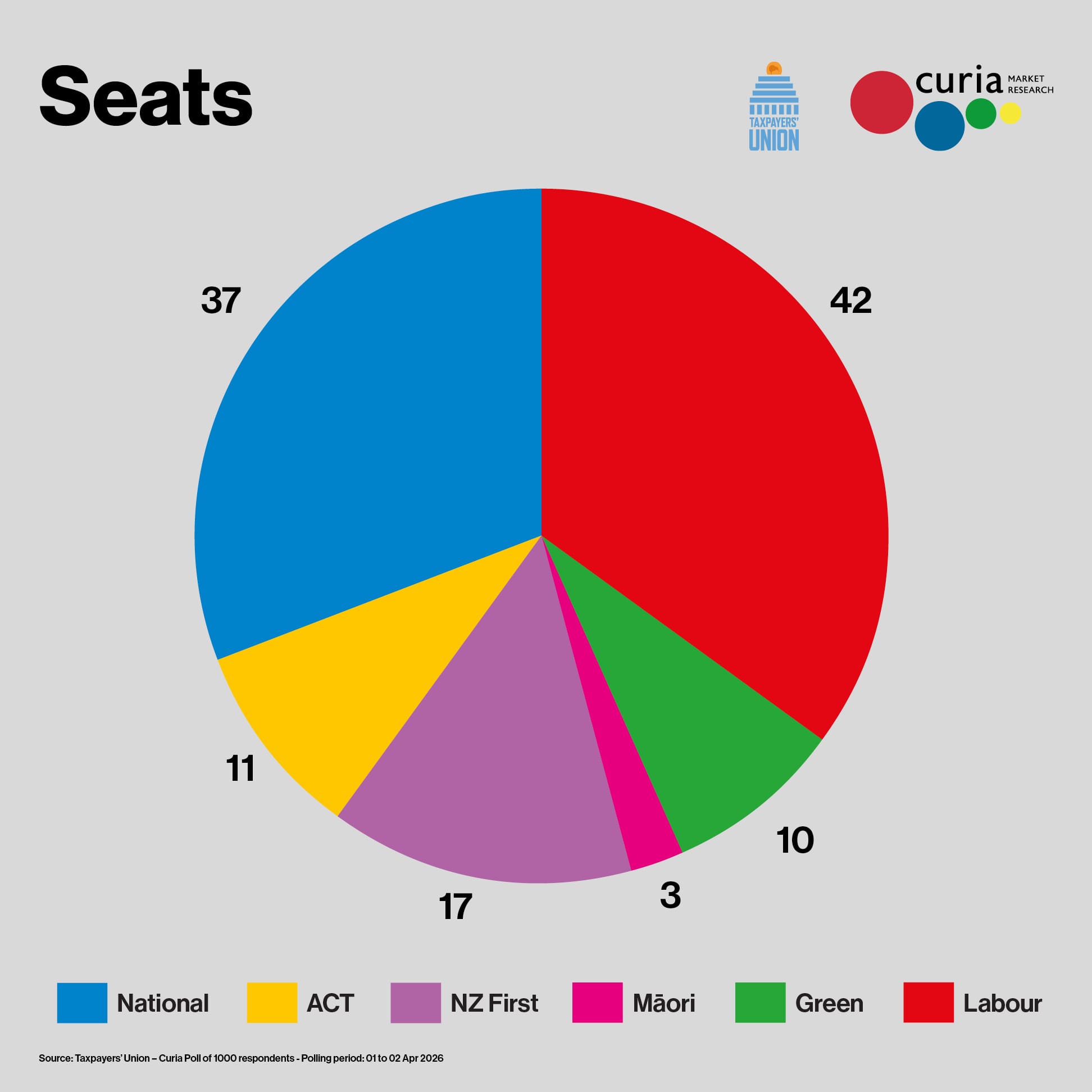 The results translate to significant seat changes in Parliament. New Zealand First would gain four seats to 17, while Labour would lose two seats, dropping to 42. National would pick up one seat for 37 total, and ACT would also gain one seat for 11.