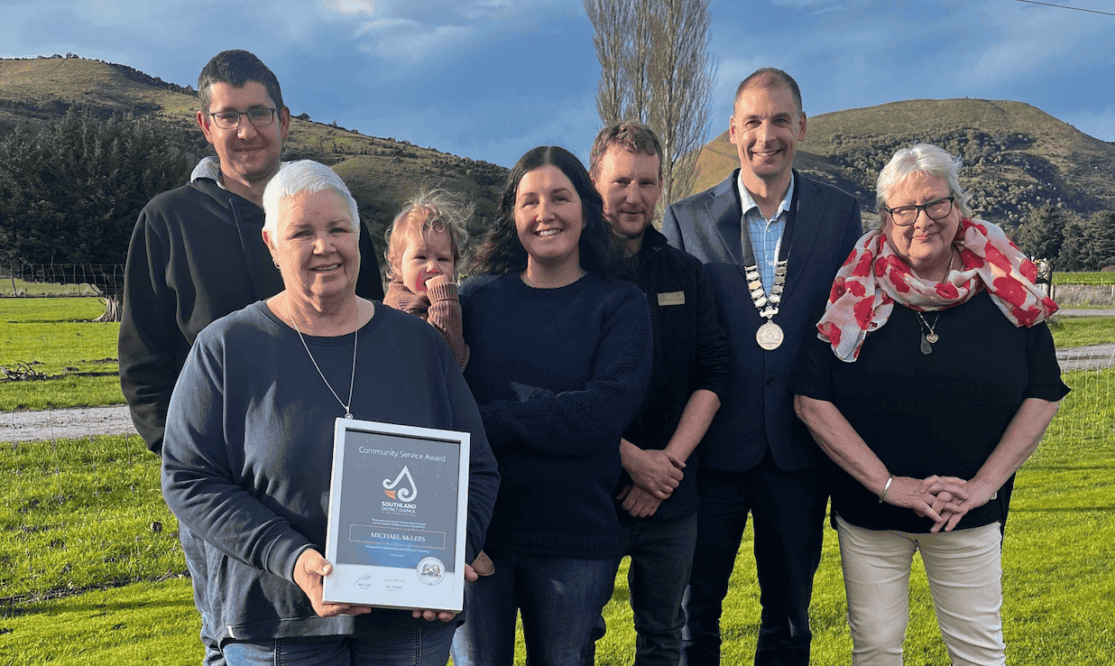 Michael McLees, a well-known figure in the Blackmount community, has been recognised posthumously with a Community Service Award for his lifelong dedication to service. The award was presented by the Southland District Council and the Tuatapere Te Waewae Community Board, with family members accepting it on his behalf.