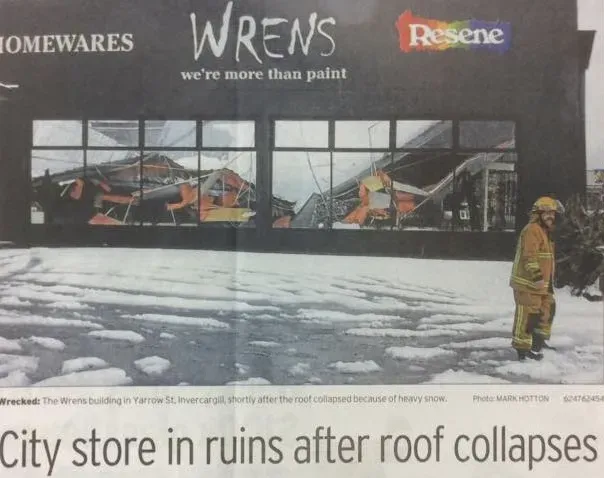 Wrens, a long-standing decorating and homewares store on Yarrow Street, also suffered damage that day. Its roof, like that of Stadium Southland, collapsed under the weight of the snow. The event highlighted the vulnerability of even well-established buildings to extreme weather.