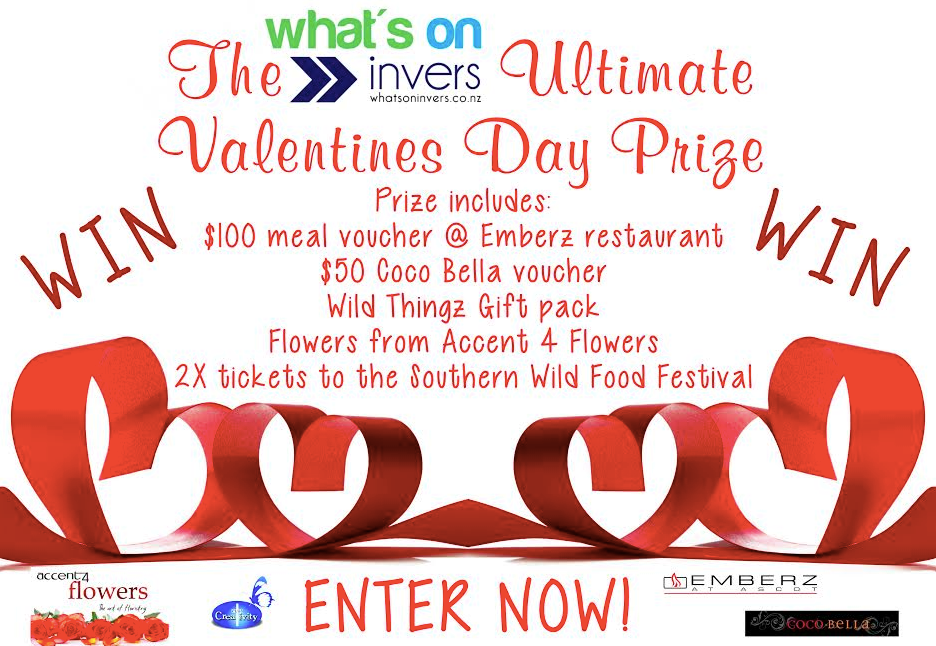 To celebrate Valentines Day on Saturday we have put together the Ultimate Valentines Day prize with goodies from Emberz restaurant at Ascot, Coco Bella, Accent 4 flowers, Wild Thingz, plus 2X tickets to the Southern Wild Food Festival.